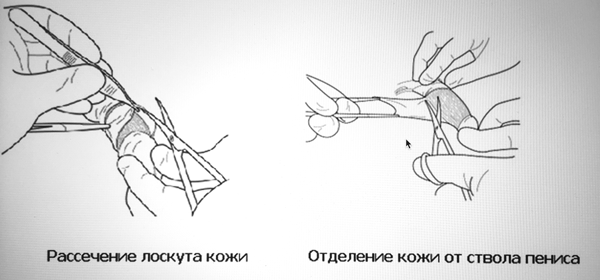 Далее образовавшийся лоскут кожи разрезается и отделяется от ствола полового члена с помощью специальных ножниц.